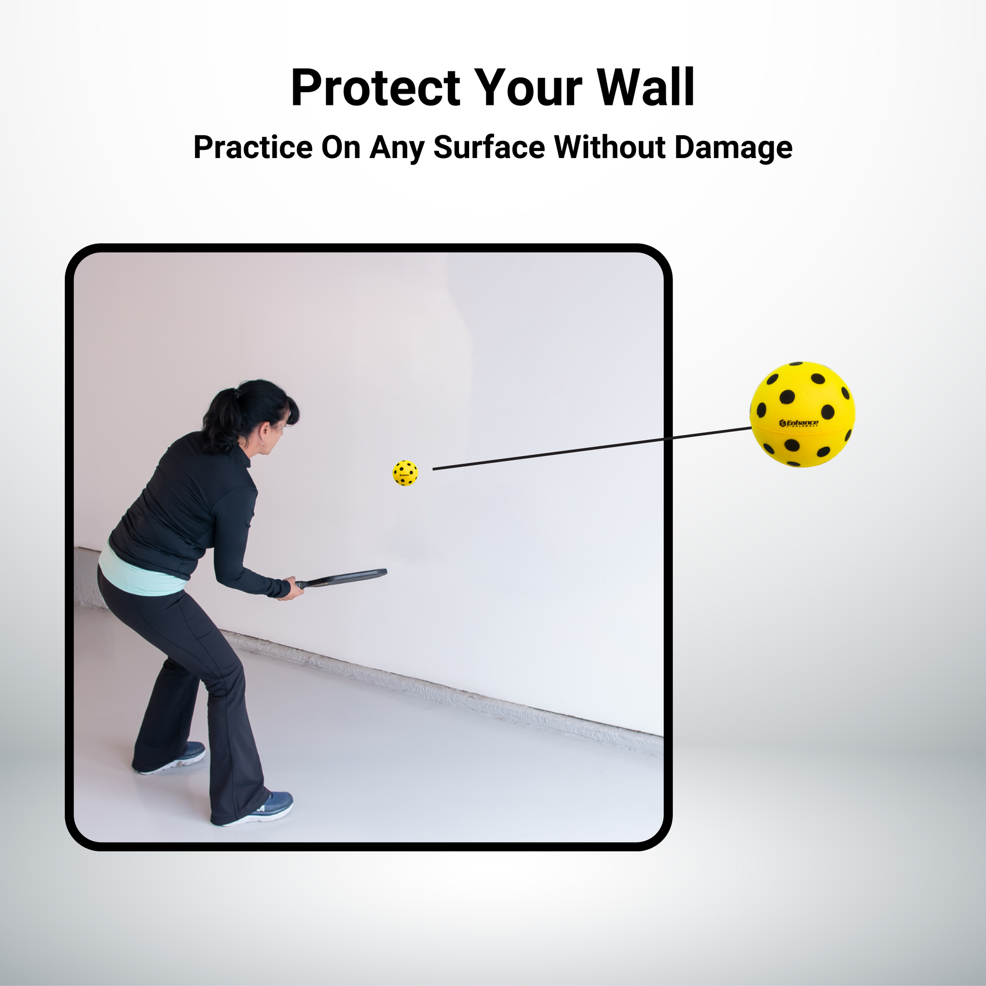 A normal pickleball is hard and will damage drywall or paint if used on it repeatedly. With the Ninja Ball, you can practice on pretty much any surface without damage.